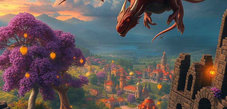 The hairs on my skin stand, an enchanted feeling rolling off me. The size of a boulder but as graceful as a swan, a dragon soars past my tower. I glimpse its armor of fiery crimson scales so shiny they reflect the sunlight, as a pair of amber eyes the size of my head blinks at me. The dragon’s wide wings with fleshy underside carries it towards delicate fluffy clouds, where more dragons of azure, oak green, black – or any color you can think of – fly together. A couple swing their long tails and breathe purple fire simultaneously, their beating wings giving a strong wind that tousles my hair.